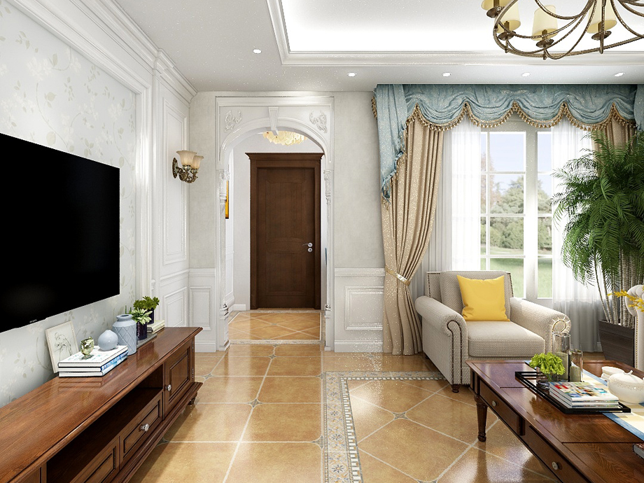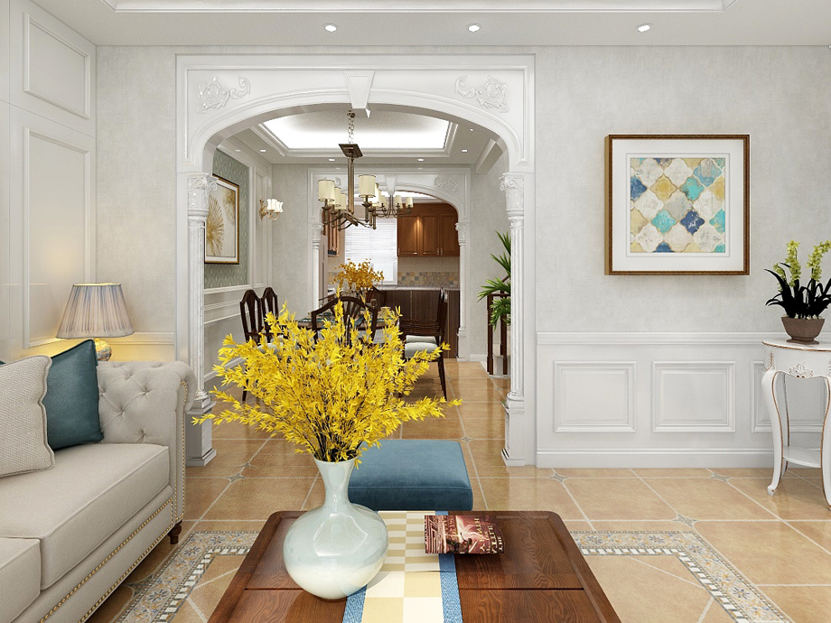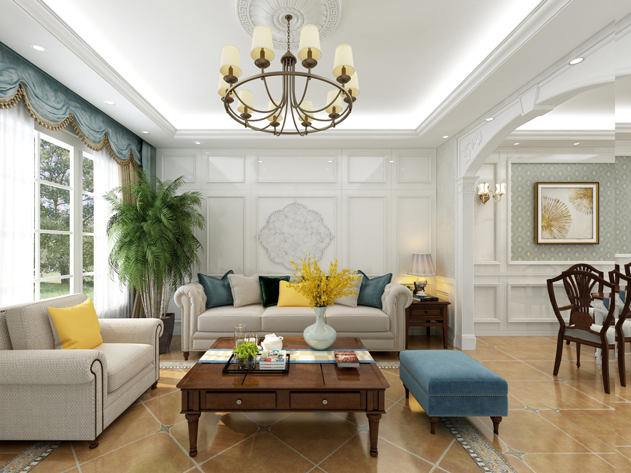 1、客廳:美式客廳風(fēng)格較多采用嵌入式石膏吊頂,搭配精致的水晶吊頂,營造出一種懷舊、浪漫的感覺。以大理石作為地面裝飾材料,光澤感佳,在沙發(fā)區(qū)鋪上大幅花紋地毯,使空間區(qū)域劃分更加清晰。復(fù)古造型的組合沙發(fā),以及茶幾都具有上乘的質(zhì)感,讓美式古典風(fēng)格得以進一步的彰顯。