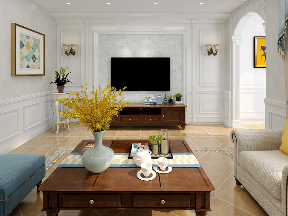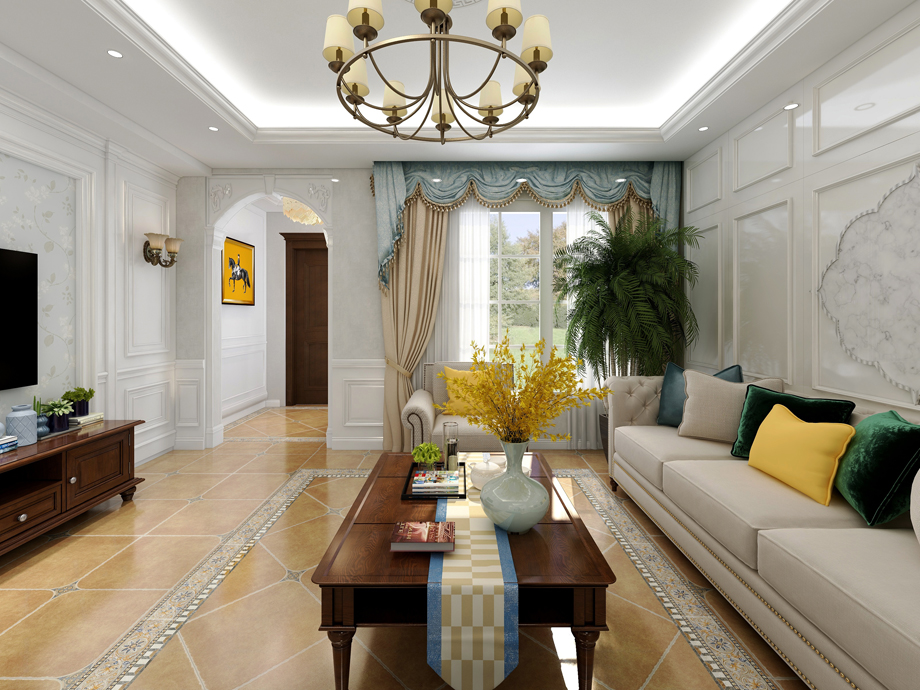 客廳作為待客區(qū)域,一般要求簡潔明快,同時裝修較其它空間要更明快光鮮,通常使用大量的石材和木飾面裝飾;美國人喜歡有歷史感的東西,這不僅反映在軟裝擺件上對仿古藝術(shù)品的喜愛,同時也反映在裝修上對各種仿古墻地磚、石材的偏愛和對各種仿舊工藝的追求上??傮w而言,美式田園風(fēng)格的客廳是寬敞而富有歷史氣息的。