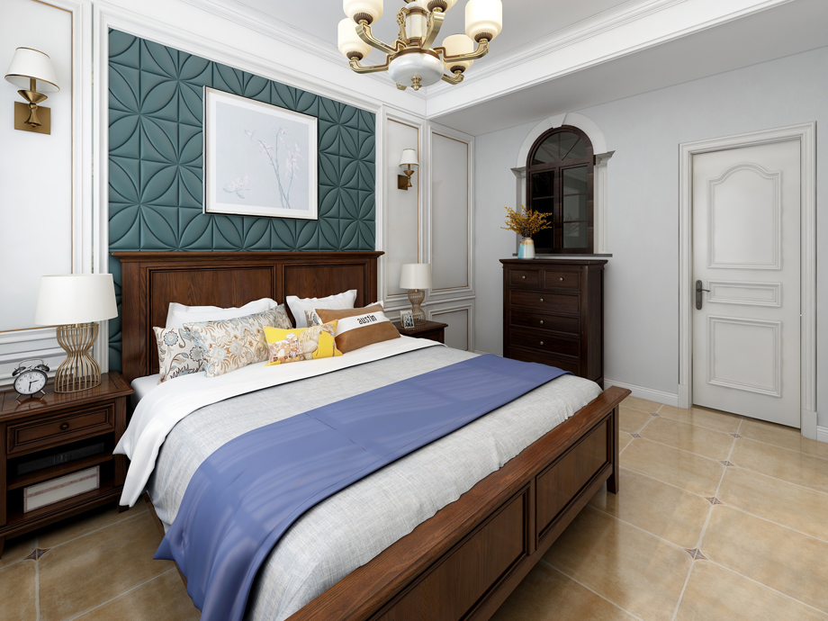 美式家居的臥室布置較為溫馨,作為主人的私密空間,主要以功能性和實用舒適為考慮的重點,一般的臥室不設(shè)頂燈,多用溫馨柔軟的成套布藝來裝點,同時在軟裝和用色上統(tǒng)一。